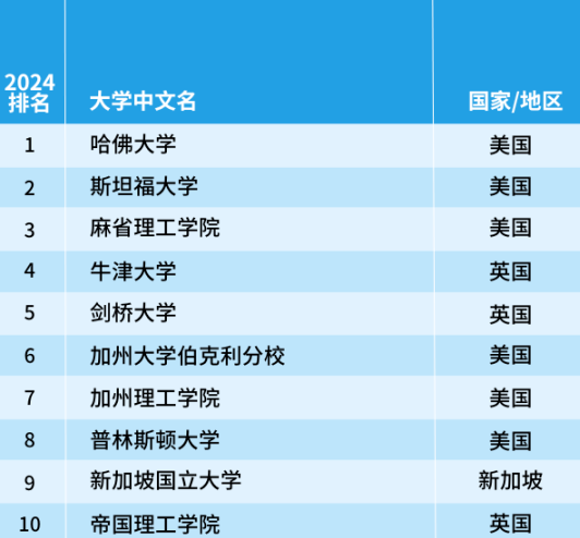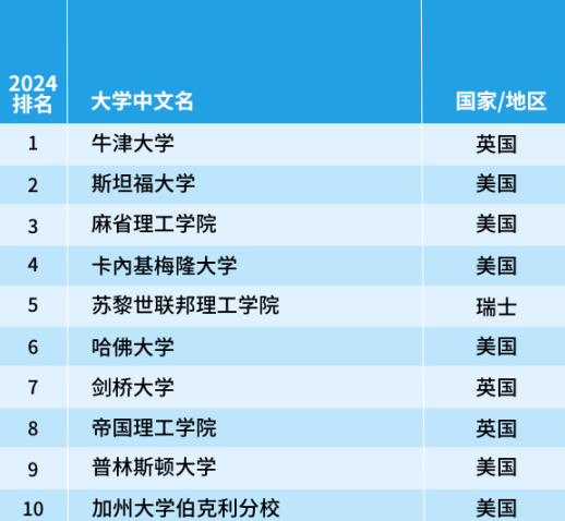 加州大學(xué)伯克利分校首次超越斯坦福大學(xué)奪得榜首,英國(guó)的牛津大學(xué)上升2名進(jìn)入榜單前三,劍橋大學(xué)依舊位于第4名。